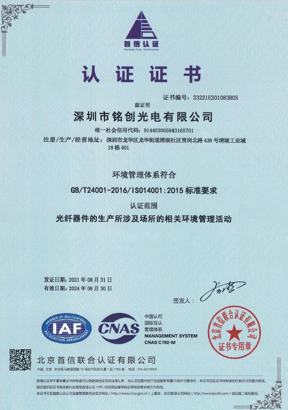 深圳市銘創(chuàng)光電有限公司于2012年成立,公司總部位于深圳市光明區(qū),是一家國家級高新技術(shù)企業(yè),通過了IS09001-2015質(zhì)量管理體系認(rèn)證和IS014001-2015環(huán)境管理體系認(rèn)證;經(jīng)過多年的持續(xù)研發(fā)投入和專注發(fā)展,銘創(chuàng)光電已逐漸成為光纖激光器、光纖傳感、激光雷達(dá)和激光通信等領(lǐng)域的綜合性產(chǎn)品服務(wù)商。 公司目前設(shè)立有光無源器件研發(fā)生產(chǎn)中心和激光研發(fā)生產(chǎn)中心。無源器件研發(fā)生產(chǎn)中心設(shè)有有高標(biāo)準(zhǔn)的無塵車間,可提供各種波長的無源光纖器件、高功率光纖器件、保偏光纖產(chǎn)品、超小型光纖器件。激光研發(fā)中心建立在安徽合肥市,研發(fā)生產(chǎn)特殊波長的激光光源、光纖激光器、光纖放大器以及新產(chǎn)品的技術(shù)研究儲備。研發(fā)生產(chǎn)中心與多地科研單位合作,能夠迅捷高效的為客戶提供相